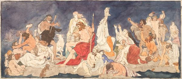 Editor: This is Charles Maurin's "L'aurore du travail," or "The Dawn of Labor," an oil painting from 1891. The figures are mostly nude, and there's this mix of classical and industrial imagery. The whole piece feels like it's surging forward. What do you see in this work? Curator: I see a potent allegory, steeped in the socio-political anxieties of the late 19th century. Note the figures' nudity— it gestures towards classical ideals of freedom and the body politic, yet it's juxtaposed with the grim reality of industrialization looming in the background. What does that contrast suggest to you? Editor: I guess it's saying something about the cost of progress? Like, industrialization is stripping away something essential, leaving us bare? Curator: Precisely. Think about the rise of socialist movements at this time. The painting evokes the symbolism of the struggle, doesn't it? The figures, seemingly driven forward, towards that factory skyline, which could reflect on a revolutionary, activist spirit. But also notice, who is being carried, who is struggling, who has agency? These considerations of who benefits, who pays the price, for social progress is still very timely. How does Maurin represent that in terms of gender? Editor: It's a little confusing. There seems to be both male and female figures leading the charge, but I'm not entirely sure what message Maurin wanted to send. Curator: And that ambiguity is key! This painting doesn't offer a simple answer. It prompts us to grapple with these complicated questions surrounding labor, exploitation, and emancipation, filtered through a lens that intersects class, gender, and perhaps even a utopian vision. The title implies dawn or some type of future for labor, or a more optimistic note. The composition, however, appears unresolved. Editor: It's interesting to consider the work in its historical context. It certainly adds layers that I hadn't immediately noticed. Curator: Indeed. By acknowledging these complex issues that intersect history, sociology and artistic vision, it might broaden the viewing lens and impact how the painting communicates in present times.