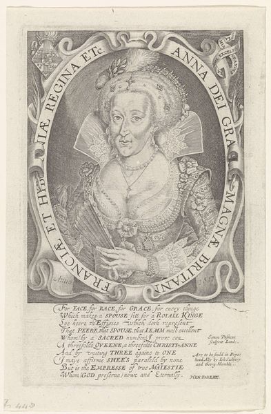 Editor: This is Theodor de Bry's "Portret van Poggio Bracciolini," an engraving from around 1597 to 1599. The level of detail is really striking, especially given it’s a print. I'm curious – what catches your eye when you look at it? Curator: It's the interplay of line and form that I find most compelling. Observe how de Bry uses hatching to create a sense of depth and volume, particularly in the subject's face and clothing. Notice the contrast between the densely worked areas and the relatively blank spaces, and the overall balance that brings. Editor: I see what you mean. It's almost like the engraving technique itself becomes a subject, right? The circular frame draws so much attention to the rendering inside of it. Curator: Precisely! Consider the oval frame, a self-contained world. Do you see how the composition relies on visual rhythm and variation to contain what might feel otherwise unbound? How do you find the lettering contributing to these effects? Editor: Now that you mention it, the inscription almost functions as another decorative element. It's not just informative; it adds to the texture of the print. Curator: Indeed. The text and ornamental detail equally enhance and animate the composition as a whole, leading our eyes to constantly renegotiate our spatial interpretation within the image. Note how the decorative foliage both embraces and constrains Bracciolini’s profile, making use of symmetry as well as a touch of the wild. Editor: I hadn't thought about it that way before. So, even without knowing the historical context, you can understand a lot just by analyzing the visual components and construction of the artwork itself. Thank you. Curator: Exactly. By considering an artwork’s formal elements, we can extract many possibilities without relying exclusively on other considerations, though these enrich our interpretation. A fruitful investigation, I think!