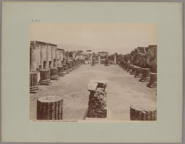Curator: Giorgio Sommer, between 1857 and 1875, captured this serene yet melancholic view titled "Gezicht op de ruïne van de Basilica te Pompeï, Italië"—a glimpse into the past, frozen in time, currently housed in the Rijksmuseum. Editor: Immediately, I’m struck by the stillness—a poignant snapshot. The ruins in sepia tones give the picture a somber, almost ghost-like presence. It whispers of life interrupted, silenced by Vesuvius's wrath. Curator: Indeed. The image gives a potent, accessible window into archaeological fervor of the time. Sommer skillfully leverages photography to document the basilica ruins. His image becomes not merely an aesthetic rendering, but an artifact, documenting a vital historical moment. Editor: Absolutely. What strikes me too, is that what remains physically becomes a symbol for other things destroyed - freedoms and entire civilizations crushed by unchecked power. How many voices went unheard, unseen within these ruins? The columns stand like ghosts refusing to be silenced. Curator: That’s a pertinent reading of the image’s symbolism. What's interesting, however, is how Sommer chooses his vantage point, creating an interplay of perspective—juxtaposing ruins and sky to elicit a sense of expanse, connecting this micro history with larger currents. Editor: But that artistic perspective can't obscure that the ruin became part of grand tours which bolstered the economies of empires, many of which, like the slave trades and colonization, were achieved on the backs of marginalized peoples whose identities became footnotes to art such as this. The beauty co-exists with painful historical injustices. Curator: And this highlights a vital discussion—that art must never stand outside societal constructs; rather it both molds and mirrors it. Photography, too, with its documentary powers, carries heavy responsibility. Editor: I think photographs of this nature are useful in the modern age, because although ruin may appear starkly unique, it is universally connective. Even if physical sites aren't the same, the underlying societal concerns continue to ring out in different eras. Curator: I agree. "Gezicht op de ruïne van de Basilica te Pompeï, Italië" invites contemplation beyond history— urging engagement within ethical dialogues on what, how, and who becomes immortalized by human endeavor.