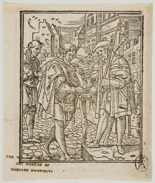 Curator: This is Hans Holbein the Younger’s woodcut, "The Advocate," part of his Dance of Death series. It’s currently residing at the Harvard Art Museums. Editor: The stark black and white really grabs you, doesn't it? Gives off this almost spooky, unsettling vibe. Curator: Absolutely. Holbein masterfully uses the high contrast to emphasize the presence of Death intruding on the advocate's dealings. Notice how Death is literally taking payment. Editor: It's like he's saying, "Time's up, counselor!" in the most literal way. The skeletal figure offering the payment, the hourglass…it's all so pointed. Curator: Exactly. The composition, the linear quality of the engraving, emphasizes the inevitability of death and the futility of earthly pursuits. Editor: It makes you think, what are we really chasing after, when all that glitters turns to dust? Curator: A somber thought, but Holbein’s skill makes it a compelling reflection. Editor: Very true; the stark imagery makes this a lasting statement.