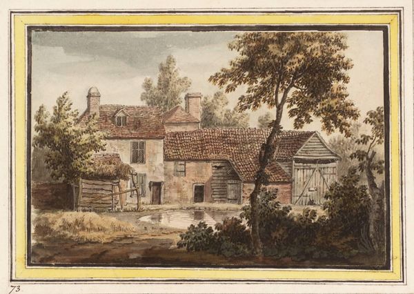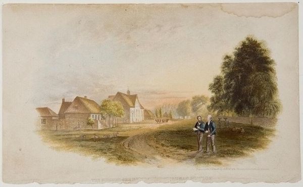 Curator: Welcome. Before us hangs Hendrik Abraham Klinkhamer's "Houses Along a Path Near Amsterdam," painted in 1859. It's a delicate plein-air watercolor, a fleeting moment captured with impressive detail. Editor: It evokes such a gentle stillness. The muted palette—the ochres and greens—creates this palpable sense of calm. Almost nostalgic. Curator: Absolutely. Klinkhamer's control of the watercolor medium is masterful. Notice the transparency he achieves, especially in the sky and the suggestion of movement in the trees. It's a superb rendering of light and atmosphere, typical of the Romanticism of the period, even verging into early Realism in its precise details. Editor: Beyond the formal elements, it offers a peek into 19th-century rural life in the Netherlands. Look at the mother and child on the road, seemingly heading into town. This slice-of-life approach also presents a kind of visual study of women's role in maintaining local customs and a social connection for the household. Curator: A fair point. We see this subject of everyday life depicted with precise strokes of color. There's also the almost geometric quality of the buildings themselves – squares, rectangles, triangles. And the texture of the thatched roofs, wonderfully replicated by Klinkhamer’s hand. Editor: These homes could represent not just shelter but a visual claim over territory, especially when gender dictates social access for the population in Klinkhamer's community. Perhaps his title emphasizes "houses along a path" precisely because it's these humanized spaces, rather than the wider land, that reflect the culture. Curator: An insightful connection to broader questions of representation. Still, for me, the enduring power of the artwork resides in the artist's masterful composition and tonal harmonies. Klinkhamer takes the ordinary, elevates it through careful formal choices. Editor: Indeed, his delicate artistry offers a potent, layered commentary, even today, reminding us to observe both our social and environmental constructs. Curator: A rewarding experience that this humble watercolor provides, prompting aesthetic consideration but also a gentle interrogation of societal norms.