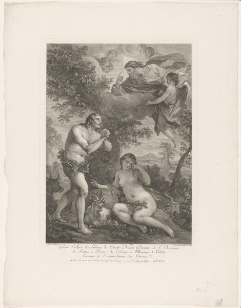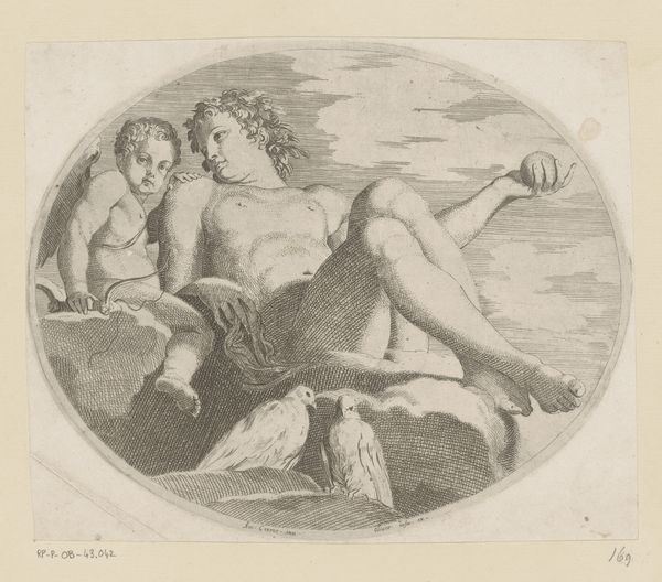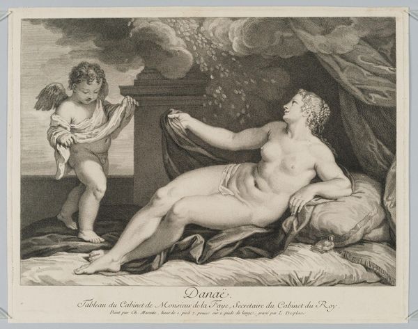 Louis Desplaces created this intaglio print titled "Jupiter en Danaë". The print's focus is on the interplay between light and shadow, achieved through fine, detailed lines. The composition is structured around the reclining figure of Danaë, whose form is rendered with a soft, continuous line. The use of shading enhances the three-dimensionality of her body, while a cherubic figure to the left adds a dynamic contrast through its pose and drapery. A rain of golden dots alludes to Jupiter’s divine intervention, creating a visual texture against the smoother skin tones. This piece engages with classical mythology through a Baroque lens, where the artist presents the subject with a formal grace and sensual appeal. The visual elements combine to challenge fixed meanings of both sacred and profane love, inviting a dialogue between divine intervention and human sensuality. In essence, the print uses its formal qualities to explore complex themes.