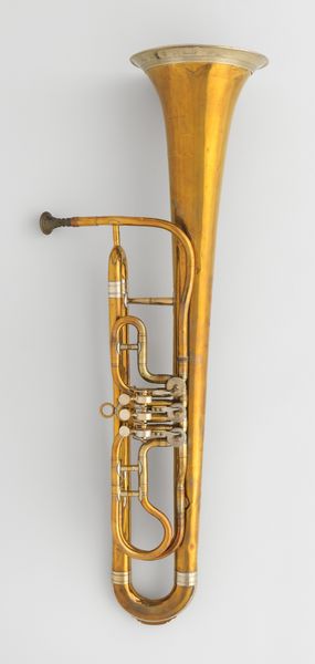 Curator: This is the Cornet Omnitonique, crafted in 1847 by Gautrot aîné in France. It's a brass instrument, housed here at The Met. What are your initial impressions? Editor: Well, it’s gleaming, like something pirates might’ve bartered for on the high seas! All that winding metal feels almost…organic, like polished vines. It’s smaller than I expected. Curator: Yes, cornets offered a more mellow sound than trumpets and became quite popular in both orchestras and brass bands during the Romantic era. Think of it as a technological step, offering different key options. It aimed to offer a full chromatic scale in one instrument. Editor: A bit ambitious, perhaps? Still, I love imagining the kind of music that was blasted out of this. Polkas at Parisian cafes, maybe? The spirit of revolution and romance all bundled together. Curator: Indeed. Its creation also coincides with a time when instruments like this were gaining visibility in more public venues, and the industrial revolution helped standardize manufacturing, so that you could find one available to more people and players of diverse backgrounds, thereby expanding its range of influence within cultural settings. Editor: That’s wonderful! Almost a populist gesture—music for everyone! I’m still caught by how sensuous the metal looks, its glow almost alive, beckoning. It makes me consider our human relationship with crafted objects. What songs do we breathe into them, and what songs do they give back? Curator: An interesting observation. Consider also, if you will, how its preservation tells us so much of what earlier people thought of musical instruments. Did it represent pride in national artistry? Personal passion for making music? We have more questions than answers, surely. Editor: And isn't that what keeps us coming back? Curator: Precisely. It speaks of untold melodies from another time that it’s kept whispering to attentive onlookers for centuries since its creation.