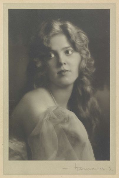 Curator: "Portrait of a Woman with Pearl Necklace Seen from the Back, Called Nora Garsten," a gelatin-silver print made around 1929. It's currently held at the Rijksmuseum. Editor: My first impression is quiet grace—it’s almost cinematic, the way the light catches the pearls. Very classic Hollywood, but with an air of introspection. Curator: Indeed, there’s an intentional play with visibility and concealment. We see this woman, Nora Garsten, seemingly revealed with her bare back, yet her face is turned away, presenting only her profile. It suggests a tension between revelation and privacy, reflecting perhaps the shifting roles of women in the early 20th century. Editor: That pearl necklace snaking down her spine, it almost feels like a physical manifestation of secrets, of unspoken desires. The way the pearls gather at the base is rather symbolic. And what about the semi-translucent fabric barely covering her shoulder? Such sensuality! Curator: The framing also contributes to the modernist sensibility, disrupting traditional portrait conventions. There is no contextual setting; she's suspended in shadow and light, the emphasis solely on the individual. Moreover, it certainly seems relevant to reflect on gender and representation. Was Nora in charge of deciding to represent herself, or was it somebody else´s creative or commercial decision? Who has the right to express ideas about female identity, body, beauty? Editor: The intimacy the photographer captures is so profound! It’s a portrait that is simultaneously present and aloof. I wonder, did Nora connect with the artist while this image was being captured? Or, perhaps she decided on purpose to be enigmatic? This really makes you think about a woman´s beauty being put on display. Curator: This photograph challenges viewers to think beyond the surface and consider the multilayered dimensions of identity and representation in art. It’s very much of its time while remaining profoundly relevant to contemporary conversations around agency, objectification, and the gaze. Editor: Looking at this print makes me feel this constant push and pull we have with ourselves about self-love, confidence and presentation to the world.