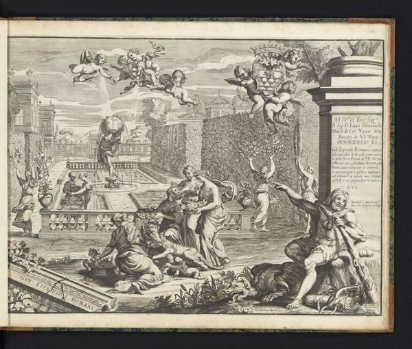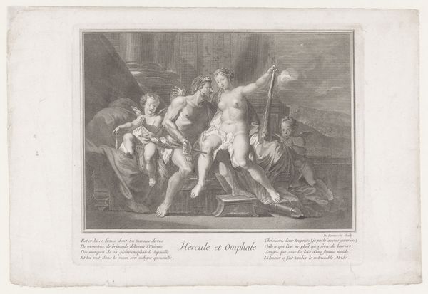 Editor: This engraving, titled "Allegory on the Death of Voltaire," was made by Charles François Adrien Macret between 1778 and 1785. The etching and engraving process gives the work an aged quality, despite its Neoclassical subject matter. What strikes me is the theatrical quality—how can we interpret its staging and symbolism through the materials and techniques used to create it? Curator: Let's consider the material conditions of its making. Printmaking, unlike painting, is inherently reproducible. This speaks directly to Voltaire’s influence—his ideas disseminated widely through printed materials. The lines are etched, each one demanding physical labor to produce, and reproduced so ideas also find labor. Think about that in terms of production. Editor: So, the printmaking technique itself underscores the democratizing effect of Voltaire's philosophy? The labor is embedded in each copy, but the message spreads broadly? Curator: Precisely. And consider the choice of Neoclassicism. This wasn't just an aesthetic preference, but a deliberate association with the perceived rationality and civic virtue of the Roman Republic. Look at the stage like composition, and imagine that setting crafted, arranged and delivered to the masses via ink. This itself presents challenges in a society still driven by aristocratic patronage. Editor: That's fascinating. I hadn't considered the active socio-political decision present in selecting the art style! In a way it adds another dimension of material to be assessed within the prints production. Curator: It encourages us to see beyond the immediate image to the context of its creation. How was this artwork received, and what kind of social exchange did the engraving elicit between the printer and the community? Editor: So, by looking at the materials and process, we understand not only the image but also how that image operated within its world. Thank you, I’ll remember to expand on that!