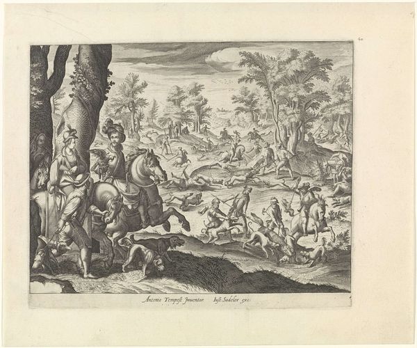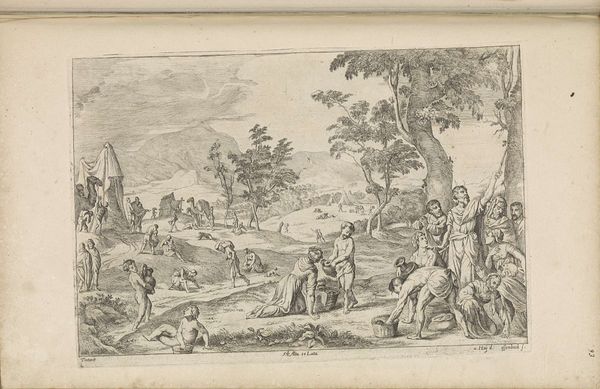 Curator: Ah, the magic of a sweeping landscape, wouldn't you say? Before us, we have an engraving titled "Landschap met paard en wagen," or "Landscape with Horse and Cart," likely crafted between 1612 and 1652. The artist, sadly, remains anonymous, a secret keeper of the Rijksmuseum’s collection. It's that classic blend of etching and engraving... it just oozes Northern Renaissance vibes with a touch of Baroque drama, doesn't it? Editor: Absolutely. What strikes me immediately is the tension. We have this idyllic setting with a waterfall and a hilltop town, but then your eye is drawn to the bottom right corner: the looming cross, a moment of quiet worship, or perhaps suffering. The journey feels more ominous than pastoral. Curator: Ominous, yes, perhaps. But for me, the allure lies in the meticulous detail. See how the engraver rendered the foliage of the trees or the distant mountains... there is so much to linger over, even on such a small scale. The hustle and bustle of daily life against the grand theatre of nature, quite a contrast to chew on. Editor: Indeed. And the composition really drives home the class divisions of the time. A merchant-type figure leads his horse-drawn carriage through this landscape, while peasants either work on or pray by a roadside shrine. These are landscapes that foreground labor, inviting us to consider the role of exploitation in the era's artistic production. Curator: You’re right, and it’s funny how landscapes of the era tended to romanticize work! Even here, with a touch of piety at the cross, it feels…contained. Less an expression of struggle, more like a piece of the scene. Still, there's a kind of peaceful resignation, as though it were a natural part of life. Perhaps the artist wanted to find beauty within the existing system? Or critique the normalisation of these hierarchies. It really pulls you both ways! Editor: Yes, precisely that push and pull. And I can't help but notice the dark cave in the lower left with two figures. Perhaps even evoking the “cave” of Plato? So it seems, this could reference humanity’s incomplete and often distorted understanding of the "real" world… something to keep you awake at night. Curator: You know, pondering such symbolism amidst this serene tableau definitely tickles my brain. So much encoded within such subtle strokes... It transforms what might seem like a pretty picture into something that pricks at your consciousness, which, if you ask me, is a good job, no matter the time period. Editor: Precisely. And isn’t that the best kind of art? It speaks across centuries because it has something urgent to say about our own messy, unequal present.