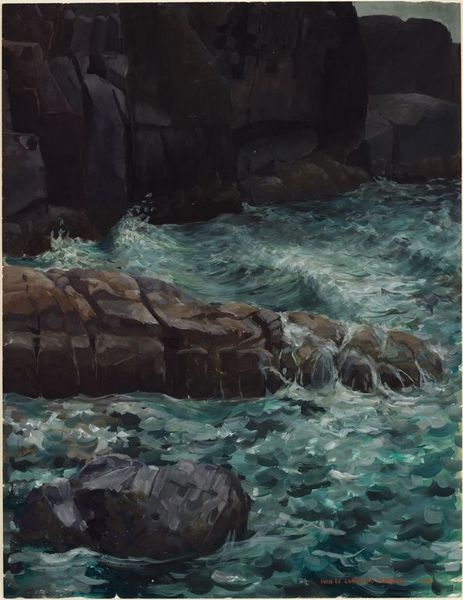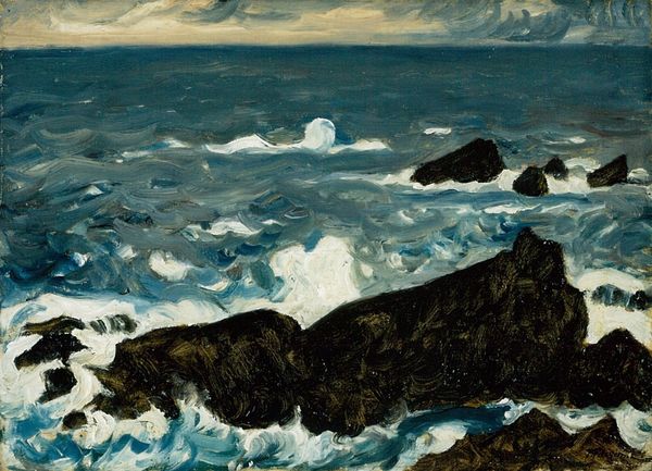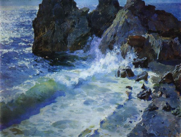 Konstantin Bogaevsky made this moody, evocative “Night at the Seaside” with oil paint, sometime in the early 20th century, though we don’t know exactly when. The painting is all about drama, mostly thanks to the thick brushstrokes and the way he uses a dark palette to build up the scene. It's like he’s not just painting what he sees, but also how the place *feels*. Check out the waves closest to us, crashing against the rocks. Notice how the whites and grays are swirled together, rough and immediate. You can practically feel the spray. Now, look at the rocks themselves; they're almost abstract shapes, just chunks of color thrown down with confidence. This isn’t about detail; it’s about capturing the essence of the scene, the raw power of the ocean meeting the land. Bogaevsky’s got this thing for romantic, kind of melancholic landscapes; I’m reminded of some of Caspar David Friedrich's seascapes. But Bogaevsky's got a wilder, more gestural touch. It's a reminder that art is not just about what you see, but how you see it, and how you feel when you do.