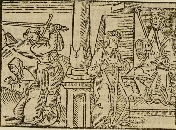 Curator: This anonymous work, held at the Harvard Art Museums, is called "Illustration III." Editor: The stark black and white feels so immediate, almost journalistic, despite depicting such a momentous event. Curator: The scene shows the Annunciation, when the Angel Gabriel appears to Mary. See how the dove, a symbol of the Holy Spirit, descends upon her? Editor: And the linear quality—it really underscores the labor-intensive process of woodcutting, where each line requires careful carving. How accessible would something like this have been? Curator: These images would have circulated widely, carrying the weight of religious doctrine and shaping collective understanding. Editor: The flowers in the vase are a nice touch, connecting divinity and domesticity. It speaks to me of the sacred in the everyday. Curator: It's truly remarkable how the artist uses such simple forms to convey such powerful cultural narratives. Editor: Yes, the constraints of the medium paradoxically amplify the message. I’m left pondering the skill involved and the audience it served.