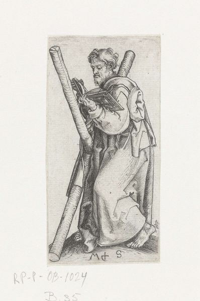 Curator: Let's turn our attention to this fascinating print. Philips Galle created it in 1578. It's a portrait, engraved on laid paper, depicting Godfried III with the Hunch, Duke of Lower Lorraine and Count of Holland. It’s held here at the Rijksmuseum. What are your initial thoughts? Editor: The figure seems almost comical. Despite the full armor, the elaborate crest, there’s something vulnerable, even a bit absurd, in his posture and expression. It is so detailed and yet manages to be almost, cartoonish. Curator: Indeed. While seemingly a straightforward historical portrait, the slightly exaggerated features suggest it might function as a caricature, albeit within the conventions of late Renaissance printmaking. These images served more than simple representation. They played into contemporary debates about power and legitimacy. The figure stands with an open hand as if taking an oath. Editor: And who decided on this particular depiction? It's interesting to consider what it might have been used for in political discourse, if it was attempting to undermine this duke or perhaps overcompensate for an image he may have struggled with by presenting a strong facade. Curator: Precisely! Prints such as this circulated widely. Their visual rhetoric could be incredibly potent in shaping public opinion and bolstering or attacking the reputation of those in power. They influenced viewers profoundly, regardless of the factual reality of their depictions. Editor: This speaks to the enduring power of images and their use and abuse in solidifying regimes of power and shaping the socio-political landscape. We can learn a great deal by viewing it with a 21st-century understanding of intersectional narratives focused on identity and gender. I see echoes here that inform the contemporary construction of the spectacle. Curator: That is a potent observation! We began thinking of it simply as a historical record. Hopefully we've teased out a bit of the nuanced meanings imbedded within. Editor: Definitely, it's another way to consider history; this helps me place my focus when interpreting a portrait such as this one.