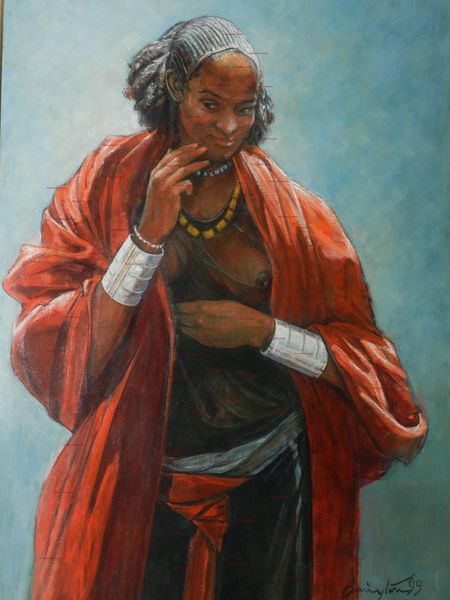 Vasily Vereshchagin’s painting, Fakir, presents a figure emerging from a flat, yellow background marked by a stark, horizontal line. The figure is presented frontally, adorned with various decorative elements and smeared with what looks like white paint. The textures and colors generate an immediate sense of disorientation. The composition, with its flat background, challenges traditional perspective, pushing the figure forward. This collapsing of space invites us to reflect on the representation of the 'exotic' other. Vereshchagin employs a semiotic vocabulary where the fakir's adornments become signs loaded with cultural meaning, yet destabilized through their presentation. The figure and its meaning are constructed within a colonial gaze, prompting questions about authenticity and representation. Notice how the artist’s use of a non-naturalistic palette and flattened space functions not merely as aesthetic choices but as deliberate disruptions, inviting us to question the very act of seeing and interpreting across cultural boundaries. The work’s enduring impact lies in its provocation, challenging us to reconsider how we engage with representations of otherness.