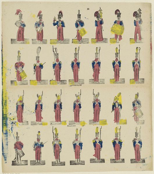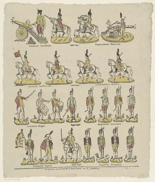 Editor: This print, created sometime between 1816 and 1849 by Monogrammist B, is called "Den ridder Don Quichot en onze Sanche Pansje, / Met het volkje van Chamacho maker hier een dansje," housed at the Rijksmuseum. It depicts rows of characters with short captions below each. What really strikes me is the repetitive nature of the figures; they almost feel like a commodity being produced en masse. What's your take on it? Curator: The commodification aspect is key. Consider the material itself – a print. It's inherently reproducible. The creation of multiple copies meant wider distribution and affordability, shifting art away from exclusive patronage. Notice how the figures, though individualized, are simplified, almost cartoonish? Editor: Yes, they definitely lack individual detail; each is more of a character type. Curator: Exactly. It's like a proto-mass-produced image. Also, consider the socio-economic context: the rise of a merchant class and a growing public with access to disposable income. Art became something to be consumed, reflecting broader societal shifts. What about the relationship between the depicted characters and the production of the print itself? Editor: That’s interesting... is the print in some ways enacting the dance the title speaks of, bringing together these disparate figures for mass consumption? I guess the repetitive, almost staged arrangement suggests the act of ‘making a dance,’ perhaps indicating how labor and entertainment were also becoming standardized. Curator: Precisely! This artwork speaks to the material conditions of its creation and consumption. The very act of producing and circulating such images participated in shaping cultural values and tastes. Editor: That makes me look at prints very differently. It’s easy to focus on the narrative, but understanding how they were made and circulated adds another layer of meaning. Curator: Absolutely. Focusing on materials and their social context brings us closer to understanding the artwork’s true value.