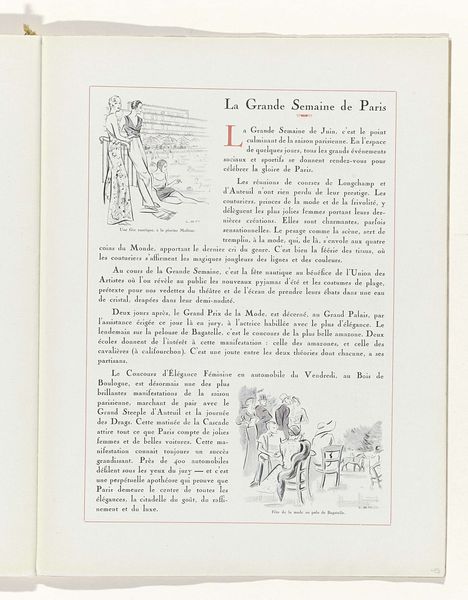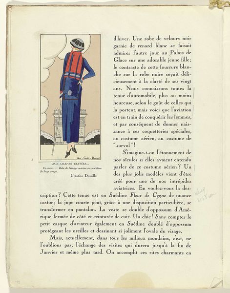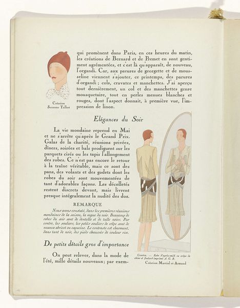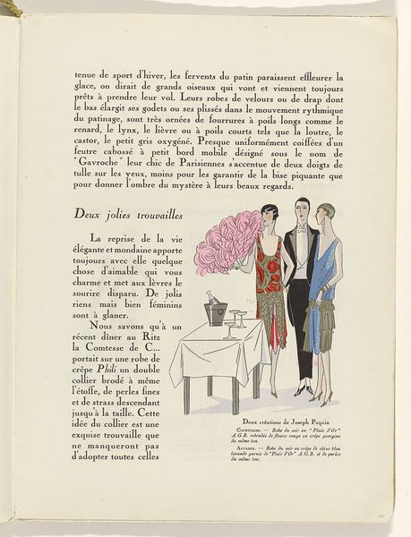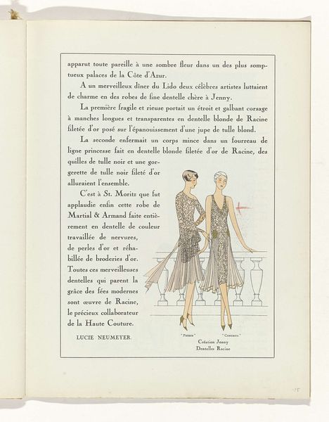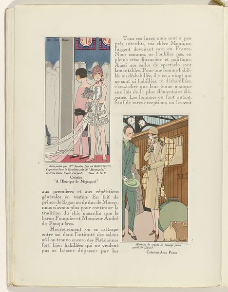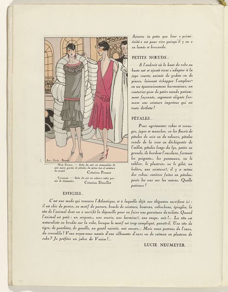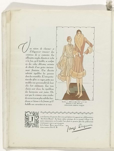 This fashion plate comes from a 1924 edition of "Art - Goût - Beauté," and it's such a beautiful example of the era’s sleek style. I love the way the anonymous artist uses a delicate, almost hesitant line to define the figures and their elaborate dresses. Look how the pastel colors are applied so thinly, allowing the paper to peek through, it's as though the image is barely there, like a fleeting memory. The textural contrast between the flat, patterned surfaces and the areas of blank space is what gives it such an airy feel. My eye is drawn to the lavender dress with the dramatic floral embellishments, it's so opulent against the sparse backdrop. It reminds me of the way Sonia Delaunay used pattern and color to create a sense of movement and rhythm in her textiles and paintings. Both artists share an understanding that it's the process of layering and arranging that gives a piece its unique energy. It’s this embrace of open-ended, evolving creation that keeps me coming back to art time and again.