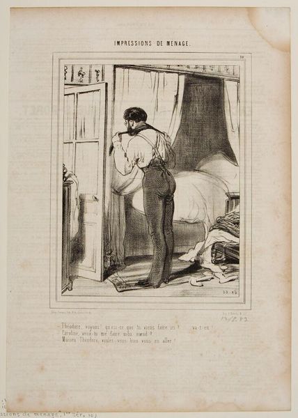 Paul Gavarni made this print, "Jongeman laat oudere heer passeren naar de salon," using lithography, a printmaking technique where an image is drawn on a stone or metal plate with a greasy substance. The lithographic process allows for incredibly fine lines and subtle tonal variations. The greasy crayon resists water, so when the stone is dampened, ink adheres only to the drawn areas. The printmaker then transfers the image to paper. Gavarni's choice of lithography enabled him to capture the nuances of social interaction with incredible detail. It speaks to the growing accessibility of image production in the 19th century. This printmaking was often employed for mass-produced images, reflecting a shift in the art world towards more democratic forms of expression. By focusing on the materials and processes, we can see how Gavarni’s work blurs the lines between fine art and commercial illustration, offering a fascinating glimpse into the social and artistic landscape of his time.