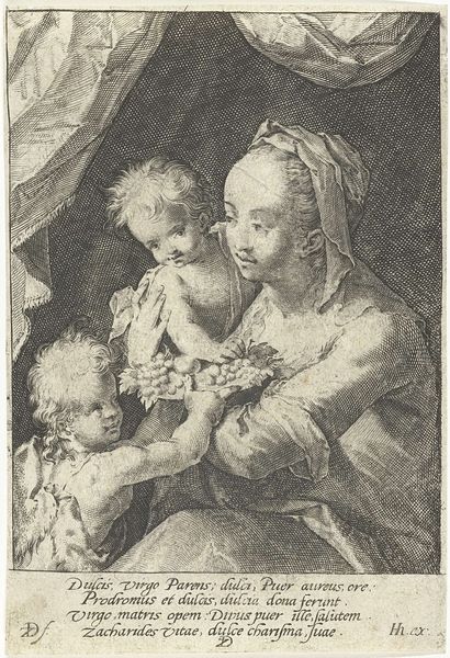Curator: "Madonna met Kind," an engraving likely produced between 1488 and 1585. The piece now resides here at the Rijksmuseum. Editor: It possesses a striking serenity. The subtle hatching creates depth and gives the figures a tangible presence on what feels like a very still, somber scene. Curator: Indeed. Observe the precise linearity of the engraving. Notice how the engraver manipulates line weight to define form and texture, paying particular attention to the drapery’s elaborate folds that enshroud Mary. Editor: Speaking of drapery, I’m really drawn to that specific textile; it’s used here not just as adornment, but to structure the overall composition, too. The density of the engraving marks speaks of serious labor and perhaps the patronage driving such detailed production. Curator: Absolutely, one can decode much here through Renaissance art theory. For instance, the Virgin's lowered gaze evokes modesty, a highly prized virtue, whilst the child clutching the fabric could be interpreted as an invocation of innocence, as he looks curiously up at Mary. The very formal elements communicate established meanings, reflecting contemporary expectations. Editor: And those elements probably speak to the consumption of similar devotional works. How many engravings were needed to make that many prints to serve its function, I wonder. Considering that distribution network contextualizes the image far beyond its immediate iconography. Also that specific sort of paper the print exists on speaks of deliberate craft traditions informing this specific print's manufacture and distribution. Curator: Interesting. Do you believe then, that such emphasis on its material properties eclipses any formal artistic intent or significance? Editor: Not necessarily eclipses, but certainly enriches. Looking at the image through production gives me access to networks of labor otherwise hidden when fixated on aesthetics alone. Curator: That offers a fascinating parallel viewpoint, prompting consideration of socio-economic realities ingrained even within sacred portrayals. Editor: Yes, recognizing the confluence between labor, materials, and cultural narratives, while allowing formal composition to deepen meaning and extend toward more worldly spheres.