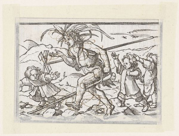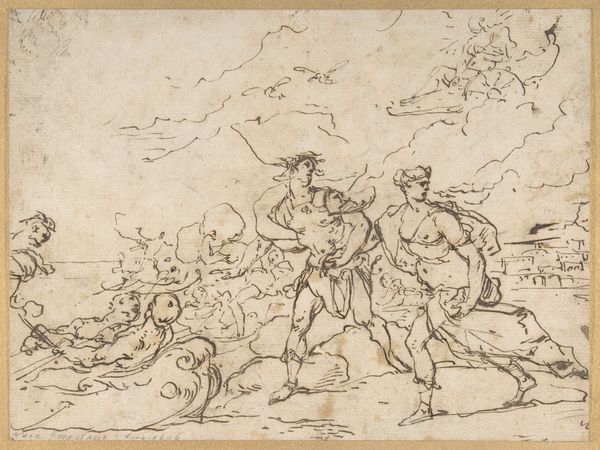 Editor: So this drawing is titled "Neptune with his Entourage, and Daedalus and the Fall of Icarus" by Antonio Carracci. It looks like ink on paper, right? There's so much going on - it feels dynamic. What catches your eye the most in this piece? Curator: The process. Look at the frantic lines. It speaks of rapid execution. Notice the repetitive use of hatching to create shading, suggesting a mass production sensibility of the 17th century workshops. How do you think the mass production of paper, affordable ink influenced the artist’s labor? Editor: That's interesting; I hadn’t thought about the materials influencing the creation like that. The rough quality almost suggests it's a sketch. Curator: Precisely. The perceived ‘roughness’ might reflect not just artistic style but also the economic realities shaping artistic labor. It challenges the traditional boundaries between high art and craft. Could this sketch function as a commodity in itself or was it simply a preliminary step in a longer production cycle? Editor: So, thinking about it as a commodity… Were these drawings traded or sold, like miniature artworks? Curator: That’s key. How was it valued then, and how *do* we value it today? Does knowing it might have been produced in a workshop with commercial intent alter our appreciation of Carracci’s artistry? The availability of the paper as material allows these drawings. Editor: Wow, seeing it that way really changes how I think about the image, and the artist's role. Thanks! Curator: Indeed, materiality gives artworks cultural meanings.