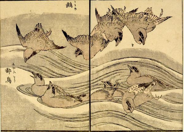 Curator: This is an image from the illustrated book "Kacho Gaden" by Katsushika Taito II, residing here at the Harvard Art Museums. Editor: Oh, what a dynamic composition! The geese in flight above contrast with the grounded flock. It feels like a visual poem about movement and stillness. Curator: Precisely, and its production as a woodblock print speaks volumes about accessibility. These images were meant to circulate, bringing art to a broader audience through a repeatable, relatively inexpensive process. Editor: It's amazing to think about how this technique democratized art. It's almost like an early form of mass media. The stark lines, the stylized forms. It’s compelling. Curator: Indeed. The very act of carving those blocks, applying ink, and pressing paper transforms nature into a commodity for visual consumption. Editor: Well, thinking about it, the geese feel so alive, even in their stylized forms. I love the duality of nature and human influence. Curator: I appreciate the attention to the production process in this work, and you bring such a wonderful, lyrical lens. Editor: Thanks, together we found something beautiful about tradition meeting modernity.