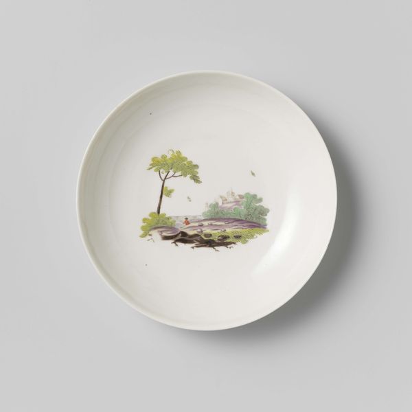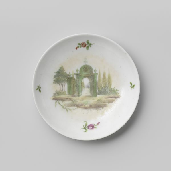 Curator: Here we have a Cozzi earthenware saucer, dating from around 1783 to 1800. It’s decorated with a tempera painting, a miniature landscape. Editor: Oh, it’s charming! So delicate and whimsical. It feels like a tiny portal to a grand estate. Like peering through a keyhole into someone's powdered-wig fantasy. Curator: Cozzi, based in Venice, was renowned for its porcelain and earthenware. The Rococo period certainly favored this type of decorative art; accessible art brought into the home, signaling wealth and good taste. It’s really about the democratization of luxury, even in this small scale. Editor: Democratization or a little gilded cage? The estate seems isolated, doesn't it? Almost like a stage set with those slender trees as curtains. I can imagine powdered ladies taking tea and plotting who-knows-what in that manicured paradise. Though I must say, the painted flowers really add something – the piece seems unfinished without them! Curator: Absolutely. The floral border is very characteristic of the era. It elevates the landscape to more than just scenery. There’s also the subtle messaging within the art form itself – to show allegiance, love, even make political statements. Editor: Imagine whispering sweet nothings or spilling scandalous gossip over this very saucer. That painted scene must have witnessed so much! Now it resides safely in a museum display. It's lost its voice somehow, don't you think? The thrill, or even the casual drama that the saucer was once used in is no more. Curator: Perhaps its voice has merely changed. It speaks now of craftsmanship, of social history, of the intricate relationship between art and everyday life. Editor: I still prefer the powdered wigs and plotting. Makes a better story. Curator: Fair enough. Either way, it prompts us to think about beauty and function. And who gets to participate in that conversation. Editor: Point taken. I’ll raise a teacup to that. A little Rococo intrigue can still spice things up.