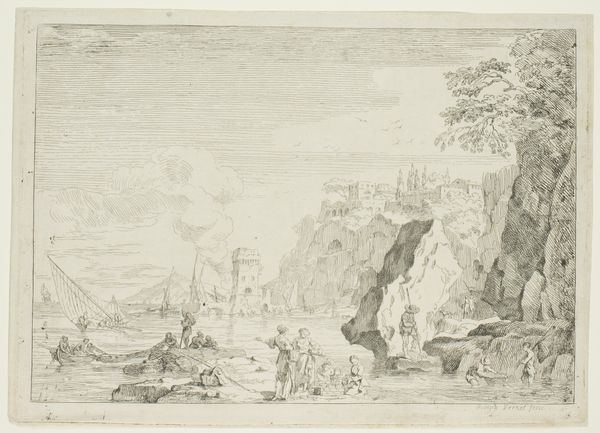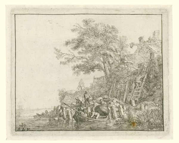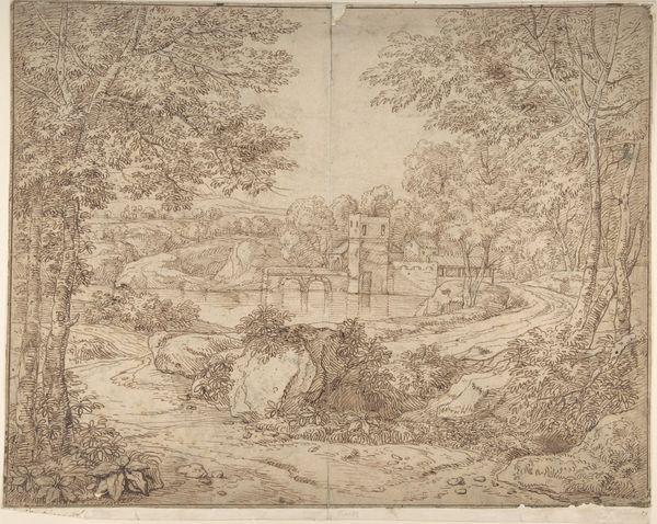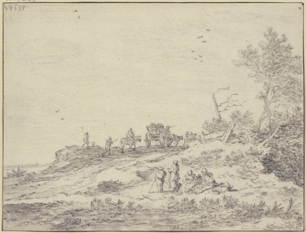 Curator: Welcome. Here we have a pencil drawing titled "Rustic House with a Well" by Jan van Goyen. Editor: Instantly, I get a feeling of faded memory looking at it, you know? The soft grays, the light touch. It’s like peering into a simpler time, something idyllic. Curator: Indeed. Van Goyen was a master of capturing the Dutch landscape's unique atmosphere. You can see how even with such spare lines, the textures are clearly defined; the roughness of the thatched roof and the serene, almost glassy, surface of the water. Editor: And it’s all so delicate, as if any heavy-handed mark would shatter the moment. That well becomes almost a symbolic fulcrum here, doesn't it? It literally raises and delivers what is a basic element. Water of Life... Curator: Wells and water, culturally speaking, often serve as symbols of life, purity, and connection to the earth, but also, it mirrors deeper, perhaps unconscious longings in us as viewers: thirst, hope, and self-reflection, like the face staring back in the well’s mirror... Van Goyen uses realism to transport us. Editor: Oh, I like that "the face staring back"! He definitely gets the ordinary Dutch life across, but not without its touch of timeless mystery. Look at the lone figures and their tasks. Very understated yet completely engrossing. Curator: The seemingly humble subject of daily rural existence gains weight precisely because it points to enduring human conditions and also Van Goyen's skill as an interpreter of what is truly precious. Editor: So true. It reminds us how little we need, maybe, to find fulfillment. Just a roof, a well, and a sense of simple purpose. Makes me want to ditch the city. Curator: Art like this does invite us to reflect, perhaps to recalibrate our inner compass. It provides perspective—the gentle hum of a Dutch countryside. Editor: Exactly. A lovely pause for the soul. It’s just right.