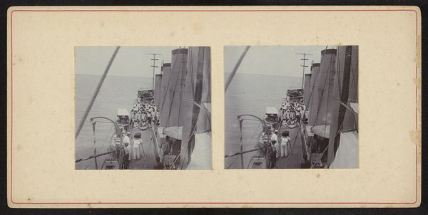 Curator: Here we have Robert Julius Boers’ photograph, titled “In de haven,” created sometime between 1900 and 1922. It’s a gelatin-silver print currently held at the Rijksmuseum. My initial reaction is one of subdued stillness. It's not a dynamic composition. Editor: There’s a definite somber mood to it, isn't there? Those figures on the bench, gazing out... They immediately reminded me of classic tropes of melancholy, figures lost in thought by the sea, contemplating journeys and distances. What do we know about the image’s creation? Curator: Boers, about whom much is still unknown, was clearly working within the conventions of pictorialism but his choice of gelatin silver points toward the mass reproducibility that would allow the photograph to exist not just as a piece of art, but also a readily available document for circulation and exchange. That suggests he envisioned the work reaching a wider audience, not only as an artwork but as a functional item. Editor: And that act of photographic recording gains further layers of meaning. A harbor always implies passage, transition. Are those naval officers? It seems a world of imperial ambition, of trade and transportation of both goods and perhaps, people too? The visual layering here – men overlooking ships sailing to ambiguous locations – sparks stories of both individual and collective experiences of migration, and the sheer mechanics and logistics required to organize them. Curator: Precisely! These materials situate it in the turn of the century moment of global shipping and increased manufacturing. One might even consider this piece as one element amongst the larger production chain, reflecting back onto it, documenting and ultimately serving the needs of this industry. Editor: I see the human element woven inextricably with larger narratives. Those uniforms are signs of power, a symbol of empire made material. However, I also see the figures seemingly dwarfed in the distance, and against a flat, somewhat oppressively overcast sky. Boers really does create a stage on which the dance of history and personal feeling play out. Curator: Indeed. Boers shows that to think through the industrial shifts also forces consideration of what the human reaction might be within the industrializing system. The photograph freezes a transient historical situation. It reveals and complicates our comprehension of progress and the human situation. Editor: Well, by looking at the men through symbolic lens, and with you examining its industrial and production-focused making, we understand the image presents this critical time.