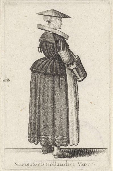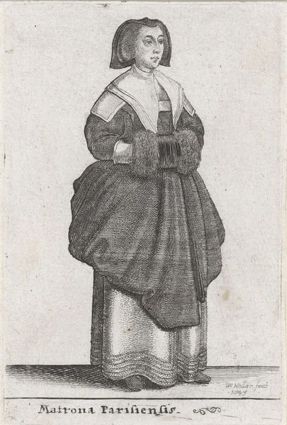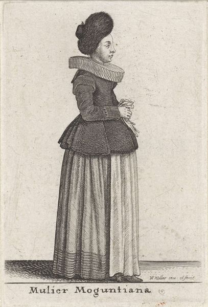 Editor: This is "Civis Coloniensis Filia," a 1643 engraving by Wenceslaus Hollar, currently held in the Rijksmuseum. I find the woman's attire so intriguing. How does this piece reflect the socio-cultural context of its time? Curator: It’s a very interesting choice for consideration. Hollar was creating these works during a period of significant social stratification and increasing merchant power. While the etching showcases the skill in printmaking during the baroque era, what I find more compelling is the almost anthropological element. Hollar is not simply depicting a woman, but visually categorizing her by her city and social standing through her attire. Editor: So, it's like a visual social register? A record of who's who through fashion? Curator: Precisely. Think of the "genre-painting" tag associated with this work; it's part of a larger artistic trend. Hollar created similar prints detailing varying ranks or citizen "types." The print itself is then consumed, reaffirming these social classifications in a growing public art market. It wasn't simply art for art's sake. These images served specific functions. Editor: Did people at the time read them that way, or is that a more contemporary reading? Curator: The intention, from what we can surmise based on social publications and other popular imagery of the time, was fairly direct. Think of the details, like the type of lace, the fabrics, and even the accessories: each communicated status, location, and profession to an informed audience. What's interesting to me is how these images might also serve an educational purpose or reinforce ideals around nationalism or regionality within cities. Editor: So this image says much more than initially meets the eye. I wouldn't have thought of it as a kind of early data visualization! Curator: Exactly. And that data visualizes power. Think about what the purpose of that kind of knowledge would be! I've learned a bit from your questions too, and your consideration for the role the consumer may take when viewing Hollar's "Civis Coloniensis Filia."