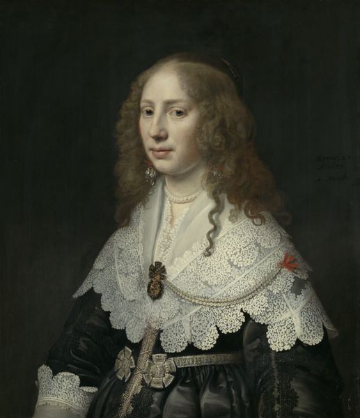 Curator: Ah, yes, this oil on canvas—a work entitled "A Lady with a Fan" by Ferdinand Bol. What's your initial take on this piece? Editor: You know, I’m immediately struck by this incredible stillness. The subject’s gaze, her posture… there’s a sense of quiet observation, almost like she’s stepped out of a dream and into this single, captured moment. A beautiful sadness or is it maybe just melancholy? Curator: Indeed. It captures the Baroque style that permeated much of the artistic landscape. Portraits of this kind served as more than mere depictions; they functioned as powerful symbols. Note the detail—it speaks to the sitter’s social standing, aspirations, and perhaps even coded aspects of her identity. Editor: You are so right about it being encoded, and speaking to that—look at the fan. So delicate. What would that signify, I wonder? Curator: The fan in this context, especially considering her social class, certainly speaks of her refined tastes and leisure, an essential prop in courtship. Editor: What's intriguing is the implied narrative; there's an almost confrontational quality in her gaze—confrontational in that maybe she can see things that remain hidden from the so called audience in her presence, in us now looking at her? Her corsetry laces also have the air of control around them, that seem to bind her literally but also psychologically, what do you think? Curator: I'd agree. It is hard to see the lace as mere ornament but is indeed laden with meaning, like a key that opens the door to further symbolism. Clothing can offer visual narratives about identity. Her attire acts like an anchor securing a role, position, and message about one’s self. The layers of clothing become an architecture of persona that simultaneously reveal and conceal the social structures in the world they inhabited. Editor: Makes me wonder, what parts of myself do I ‘perform’ daily? Thank you so much! This gave me plenty to ponder about how historical social norms relate to my own present, lived experiences. Curator: The painting seems to transcend time, inviting contemporary reflections, like how you express your personal thoughts and ideas in response to your encounter here. That's where the real treasures are found in art, and the ongoing stories it holds!
