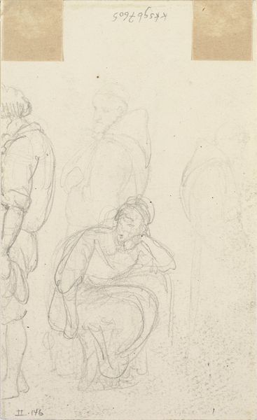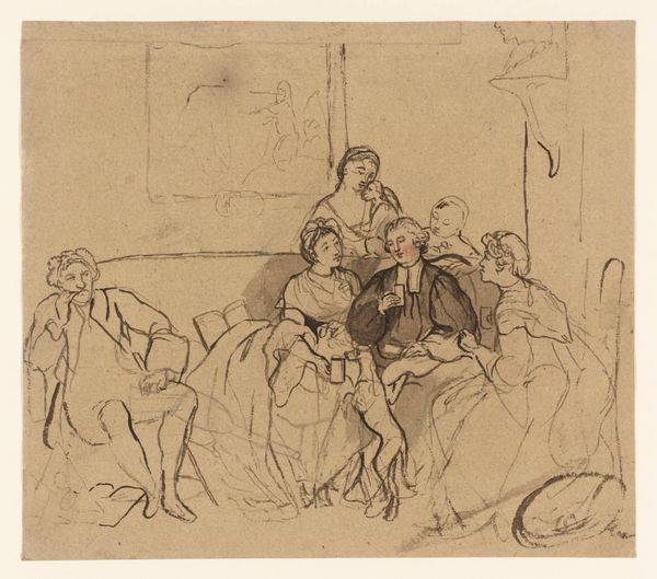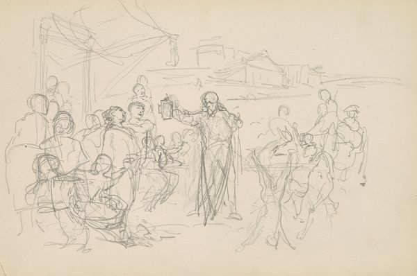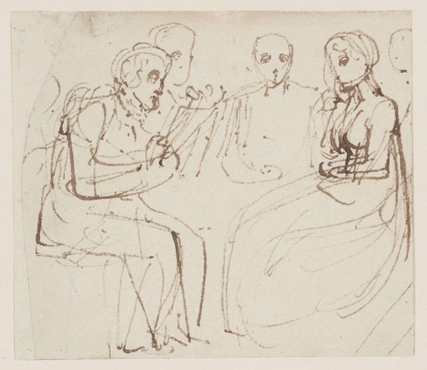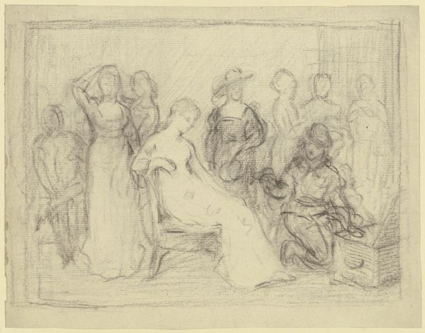Sir John Everett Millais created this sketch of "An Evening Party" using graphite on paper. Millais was at the forefront of the Pre-Raphaelite Brotherhood, a group that challenged the artistic conventions of their time in Victorian England. This drawing offers a glimpse into the leisure activities of the upper class, highlighting their social gatherings. Yet, it also gives the sense of a rigid social structure, of formality and constraint. Millais’s loose sketching style here is more casual and intimate than his finished paintings, revealing the artist's immediate impressions. Understanding this piece requires diving into the history of Victorian social life, looking at etiquette guides, fashion trends, and the economics of leisure. What did evening parties represent in terms of social mobility, cultural capital, and gender roles? Only through the analysis of historical resources can we begin to see this drawing as more than just a casual sketch, and more of a window into a particular time and place.