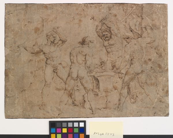 Curator: Hello, welcome. This drawing, "Udkast til gruppen p\u00e5 fire personer, her med mere livlig gestik," by Nicolai Abildgaard, made sometime between 1743 and 1809, seems to be a study using pencil and mixed media. The initial impression I get is a scene of dynamic action, but with figures somewhat subtly rendered. What's your reading of it? Editor: The composition, even in this early state, seems to imply grand gestures and a narrative unfolding. However, much of the scene appears unfinished, lending it a ghostly quality. How do you interpret the artist's approach to line and form here? Curator: Observe how Abildgaard uses line primarily to define volume and motion. It is not so much about representing contours as it is about suggesting movement through energetic strokes. The negative space plays a vital role. Do you notice how much is *not* there, but is implied? Editor: Yes, I see it! The absence of detail almost adds to the drama, like the figures are emerging from a mist. Is that a common trait of sketches from this period? Curator: It reflects an interest in capturing the essence of a moment or figure. Note that even with its spare execution, we see clearly the underlying structure—how Abildgaard built form through fundamental geometric shapes. It's almost a deconstruction before it is a construction. The artist seems particularly attentive to the relationship between forms and planes. Editor: It’s interesting to see how much the basics influence everything, even in seemingly unfinished works. Curator: Exactly! A focus on form allows the artwork to engage in an aesthetic conversation about structure and essence. And as you observe the intrinsic visual organization, your comprehension deepens, doesn't it? Editor: Absolutely. It’s made me appreciate the artistic decisions that go into even a preliminary sketch. Thanks for sharing your insights! Curator: My pleasure. It's been a revealing analysis, considering how form governs even the most tentative gestures of an artwork.