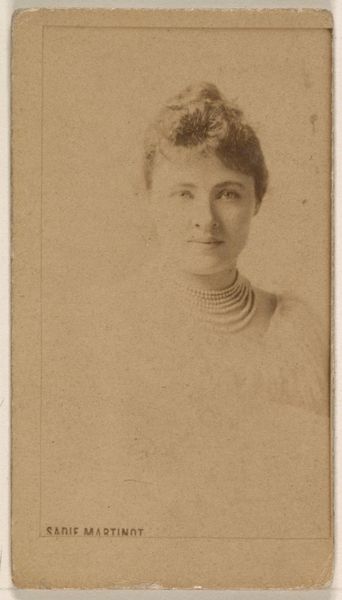 This small photographic print of Emily Rigl, from the Actresses series was created by the Kinney Brothers Tobacco Company. Its subdued sepia tones and compact size create an intimate viewing experience. The composition is structured around the play of light and shadow, which gently models Rigl's face and draws attention to her pearl necklace. The soft focus and warm color palette evoke a sense of nostalgia, characteristic of the late 19th century. The image functions as both a portrait and an advertisement. Note how the formal qualities, such as the delicate lace and pearl embellishments, speak to the aspirational values associated with the actresses of the time. The printing of Rigl's name at the bottom flattens the image, underscoring its commercial purpose. Ultimately, it is through these formal elements that the image operates within a semiotic system, where the actress's likeness becomes a signifier of beauty and sophistication in a rapidly changing consumer culture.