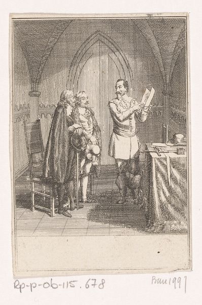 Daniel Nikolaus Chodowiecki created this print titled 'Michele Bonelli in gesprek met Hendrik IV van Navarra over zijn huwelijk' using etching techniques. Notice the stark contrast between the light and dark areas, a key element in Chodowiecki's etching. The composition is structured around the linear quality of the etched lines, which define the figures and architecture. The artist’s hand is evident in the meticulous cross-hatching, creating a rich texture within the monochromatic palette. Consider how the artist uses this contrast not just to render form, but to emphasize the tension in the scene. The structural rigidity of the vaulted ceiling above seems to press down on the figures, enhancing the sense of deliberation and perhaps confinement within social and political structures. This interplay between light, shadow, and architectural form serves as a semiotic marker, pointing to larger themes of power, negotiation, and perhaps even the constraints of matrimony. It invites us to consider how formal elements can embody and communicate complex narratives.