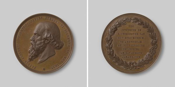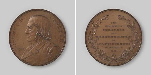 This bronze medal was created by Ludwig Jünger to commemorate Christophorus Henricus Didericus Buys Ballot, who was a professor at the University of Utrecht for forty years. The medal's design is a careful balance of symbolism and skill. The choice of bronze, a durable and historically significant metal, lends the piece a sense of gravitas. The high relief portrait of Buys Ballot and the inscription on the reverse would have required meticulous carving of dies. These would be used to strike the medal, a process involving considerable force to impress the design onto the metal. The laurel branch is a classical motif, signifying honor and achievement, appropriate for a distinguished academic. The inscription, celebrating forty years of fruitful academic labor, speaks to the value placed on intellectual contribution. This medal is not just an object; it's a testament to the enduring legacy of academic dedication, and the craft traditions used to celebrate it.