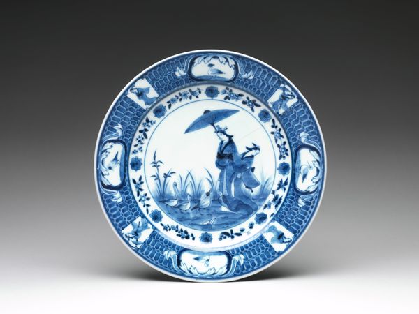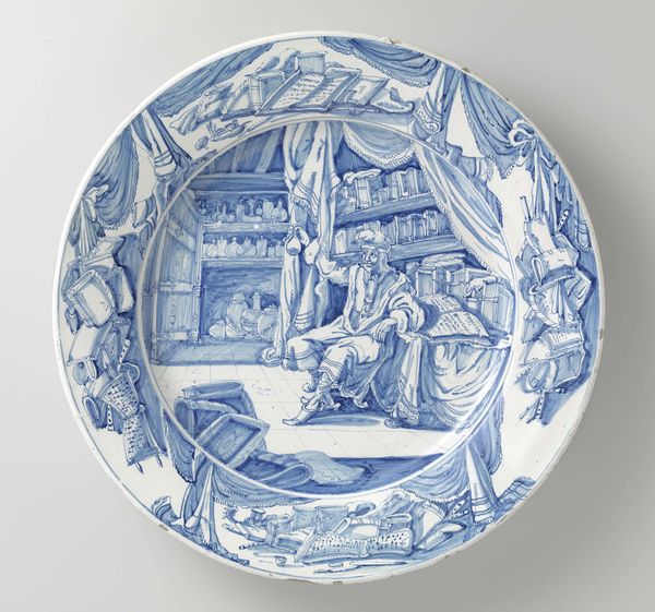 Curator: Here we have an Italian Renaissance ceramic piece titled "Dish with a Landscape," dating from 1540 to 1550. Editor: It’s mesmerizing, really. Just this striking monochrome blue scene, perfectly captured on a domestic object. It looks simultaneously inviting and a little forbidding. Curator: The entire scene is painted in shades of blue and white. Can you unpack a bit about why you feel it is "forbidding"? Editor: There’s a formality, maybe, an implied distance despite the detail. It's clear that such dish wasn't designed for daily, unremarkable eating, it makes me wonder who created such object and its socio-economic place, maybe part of a wealthy table setting that elevated dining to a cultural statement. I wonder about the labor in creating something like this, of a careful layering process. Curator: Good point. Considering the broader cultural symbolism, the landscape is not just any landscape. It invokes the idealized views of harmony and order associated with Renaissance thought. Look at the buildings, the waterways—they echo the symbolic weight of human progress over the natural world, a testament to civilization and prosperity. Editor: Yes, civilization neatly arranged and controlled. What kind of materials and pigments were used? Where were they sourced, and how did that influence the final product? Did the artisan use fresco techniques to replicate that medium's effect on ceramics, creating an imitation of "high art"? It opens a whole world of production considerations that shaped the finished artifact. Curator: The blue, of course, conjures the heavens, fidelity, trust… virtues esteemed by those who originally owned the piece and their counterparts, thus lending this daily object the sublimity that relates the person to greater matters beyond their everyday life. Editor: Absolutely. It also draws attention to itself as an object. The careful choice of material and technique points toward consumption but at a higher level where, in fact, is not necessarily meant to be used but displayed. I find this kind of pieces an important clue on the history of product design, a proto-industrial application to cultural meaning. Curator: Looking closely, it seems a dance of contrasts between symbolism and reality, technique and expression. Editor: Precisely, making this seemingly simple dish a repository of social narratives waiting to be examined under a microscope.