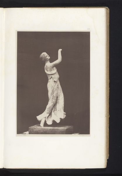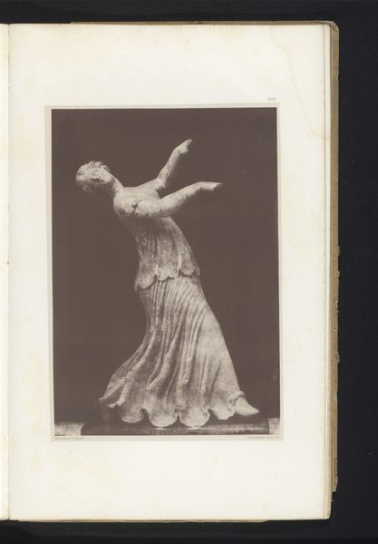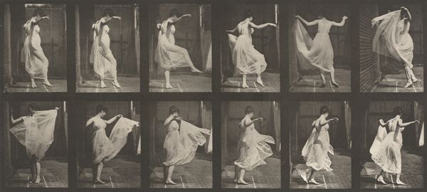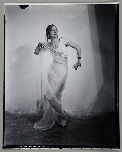 Editor: This is a gelatin-silver print from 1940, a still from Barbara Morgan’s photographic interpretation of Martha Graham’s dance, "Letter to the World." It's powerful—full of movement, but also a sense of deep sorrow, or maybe struggle. What strikes you about this piece? Curator: What I see is a complex representation of the female body in motion, staged within a visual language deeply engaged with modernist explorations of form and identity. The dance itself draws from the story of Emily Dickinson, suggesting themes of confinement and self-expression. Considering the historical context, created on the cusp of the U.S. entering WWII, what can we say about the symbolism inherent in the contorted body of the dancer, and its dramatic yet isolating composition? Editor: That’s a great point about Dickinson. So, is the isolation, visually emphasized by the stark contrast, connected to larger feelings around the war? Curator: Precisely. We have the body communicating where words fail. What does the relationship between the dancer, the garment, and the photographic medium itself tell us about female agency during this pivotal time? This work pushes beyond the traditional constraints of portraiture. Editor: It's interesting how the photograph, in a way, liberates the performance. Freezing a moment in time but also amplifying the feeling. It’s both an image of restriction and a powerful statement. Curator: Yes, and by considering the gendered experience, particularly the limits placed on women's voices and bodies, we gain insight into the intersections between dance, photography, and social commentary. Editor: I hadn't thought about it in terms of agency and resistance. Seeing the photo through that lens really enriches the whole experience. Curator: Absolutely. Approaching the artwork as a response to those dynamics makes its relevance incredibly striking.