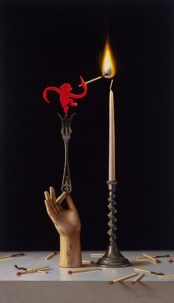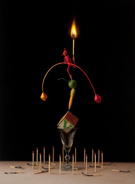Here we have “Hot Bunny” by Scott Fraser. Against a stark black background, a child’s red toy, formed by two chopsticks, stands sentinel over a lit candle. The composition, dominated by the stark diagonals of the chopsticks, converges at the base of the candle. This creates a structured yet playful dynamism. Fraser uses formalism to explore how the piece creates meaning. The semiotic interplay between the child's toy and the candle engages with cultural codes. Does it challenge fixed meanings? The child’s toy juxtaposed with the burning candle hints at a destabilization of innocence. Fraser's strategic use of light against darkness manipulates our perception, challenging conventional aesthetic expectations. The formal qualities of “Hot Bunny,” such as the stark contrast between the red chopsticks and the candle's flame, function not merely aesthetically but as a commentary on transient joy. Fraser’s composition captures a moment of fleeting beauty. It invites us to consider the transience of life's simple pleasures.