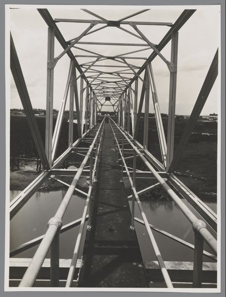 Johann Heinrich Schönscheidt created this albumen print titled "Railway Bridge over the Lek at Kuilenburg (Culemborg)." As industrialization swept through Europe, bridges like this one became symbols of progress, connecting not just places but also people and economies. In the context of the 19th century, these structures represented a shift in how societies perceived distance and time. They facilitated trade, migration, and cultural exchange, altering social fabrics and challenging existing power structures. The figures captured on the bridge add a human element to this industrial landscape. Who were these individuals? Were they engineers, laborers, or simply curious onlookers? Their presence invites us to consider the human experience within the context of technological advancement, and how structures like these shape our relationship to the environment. Schönscheidt doesn't just document a bridge; he captures a moment where human lives intersect with the forces of industrialization. This work makes us think about the intersection of progress and lived experience.