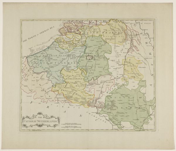 Curator: Looking at this print, I’m immediately struck by the density of detail – it feels like a landscape woven with a million tiny threads. Editor: That’s a beautiful observation. What we’re looking at is "Kaart van de hertogdommen Brabant, Gulik en Kleef," a map created in 1628 by Gerardus Mercator. As you can see, it's an engraving, so your impression of 'woven threads' is especially apt. Curator: An engraving from the Dutch Golden Age! How did Mercator approach this territory politically, or socially, during the complexities of his time? Editor: As an iconographer, my first inclination is toward the rivers and waterways rendered almost like veins. This speaks volumes about trade routes and interconnectedness during a time of immense social and political change. Rivers meant power and accessibility. The symbolic emphasis on them underlines their real value. Curator: Yes, I think viewing maps is especially salient now. This engraving visually constructs a specific geography, suggesting ownership and control – claims made manifest on paper. What does the detail, or lack thereof, tell us about who and what was prioritized? And who was deliberately omitted, if anyone? Editor: A valid point. Mercator's projection distorts as it expands northward, favoring certain latitudes at the expense of others. It begs the question, how do cartographical choices inadvertently reinforce political power and cultural assumptions? I would love to delve further into how place names carry specific cultural weights, shaping identities and narratives tied to these regions. They are, after all, visual symbols on the cultural psyche, emblems, in other words. Curator: Absolutely, by examining Mercator’s work through our own contemporary lenses, we start to unveil how maps like this became powerful tools. A means for shaping geopolitical perspectives and cementing narratives of cultural dominance and regional definition. Editor: True, viewing it from an iconographic perspective reminds us of their enduring cultural legacy. These are not simply maps; they are repositories of layered symbolism that shape and perpetuate stories across generations. Curator: Seeing it with those stories etched in reminds me that we must look critically at the assumed neutrality of these historical artifacts. Editor: Indeed. And this one’s invitation to re-imagine these ancient territories and the values placed on its regions might prompt reflection and possibly, trigger our audiences own identity.