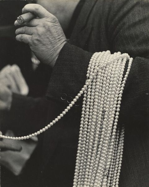 Robert Frank’s gelatin silver print captures a seemingly candid moment in New York. Frank, a Swiss immigrant, embarked on a cross-country road trip in the mid-1950s, funded by a Guggenheim Fellowship, to document American society. In this photograph, a man's hand holds up multiple chains, possibly medals or religious tokens. Beside him stands a man in what looks like military uniform. The blurred background gives a sense of a bustling crowd, perhaps suggesting an event or gathering. It's a fleeting, ambiguous image, reflecting Frank's interest in capturing the pulse of America. Frank's work often explores themes of alienation and social tension. "Medals/New York" encapsulates these themes by showing an unidealized view of American life, hinting at both its promises and its contradictions. The photograph leaves us to reflect on themes of value, belief, and the individual's place within a larger societal framework.