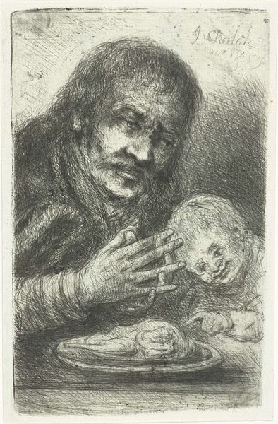 Editor: So, this is "Keisnijder (het Gevoel)" or "The Stone Cutter (The Feeling)" by Jan Verkolje I, dating from the late 17th century. It’s an engraving, and it’s quite striking! It feels very theatrical, almost like a comedic scene from a play. What do you see in this piece? Curator: Well, immediately I'm drawn to the power dynamics at play. Consider the socio-economic context of the Baroque era. "Keisnijder," or Stone Cutter, refers to a quack surgeon who would supposedly remove "stones of madness" from people's heads. This print isn't just a humorous genre scene, it critiques the exploitation of the vulnerable and gullible. How might contemporary notions of medical consent inform your reading of this piece? Editor: I hadn't thought of it like that, more of a silly scene. So the 'stone cutter' is essentially a con artist preying on people? Is Verkolje commenting on the wider social anxieties of the time? Curator: Exactly! It's a commentary on the period's societal anxieties, the commodification of healthcare, and how those in positions of authority—however dubious—can manipulate others. Look at the expressions. The 'patient' is in clear distress, while the 'surgeon' is almost gleeful. It speaks volumes about who benefits and who suffers within these unbalanced structures, doesn't it? What are your thoughts on how class might influence how we read the dynamic today? Editor: It definitely makes me think about class disparities and access to reliable information, especially considering how easily misinformation spreads even now. I didn't initially see past the surface-level humor, but your reading sheds light on deeper, troubling themes. Curator: That's the beauty of art! It allows us to reflect on not only historical injustices but also contemporary issues of power, exploitation, and inequality. Recognizing these recurring patterns encourages a critical dialogue around ethics, authority, and individual agency, even within fields like modern medicine.