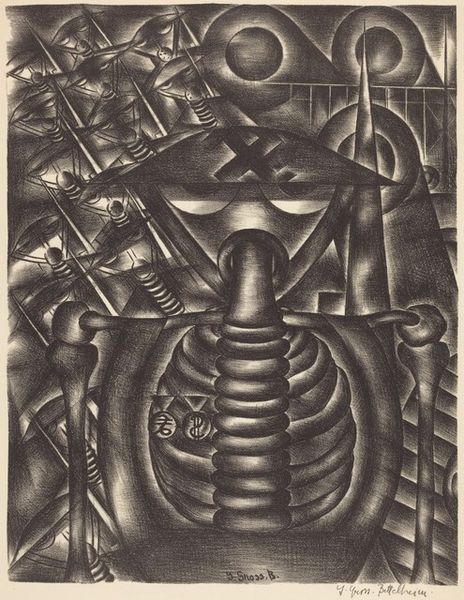 Jolán Gross-Bettelheim created the print "Home Front" to highlight the role of women in industry during times of conflict. The context of its creation lies in the historical shifts of the early to mid-20th century, when women increasingly entered the workforce due to war efforts and changing societal norms. Gross-Bettelheim presents an image of women working on what appear to be cannons. This depiction not only reflects the changing gender dynamics in the workforce, but also raises questions about women's involvement in the machinery of war. Are these women empowered or exploited, contributing to a cause or caught in the cogs of conflict? The print makes me consider the complex intersections of gender, labor, and patriotism. In "Home Front", Gross-Bettelheim captures a sense of both strength and constraint, inviting us to reflect on the multifaceted roles women play in society, particularly during times of upheaval. It serves as a reminder of the personal and collective experiences that shape our understanding of history and identity.