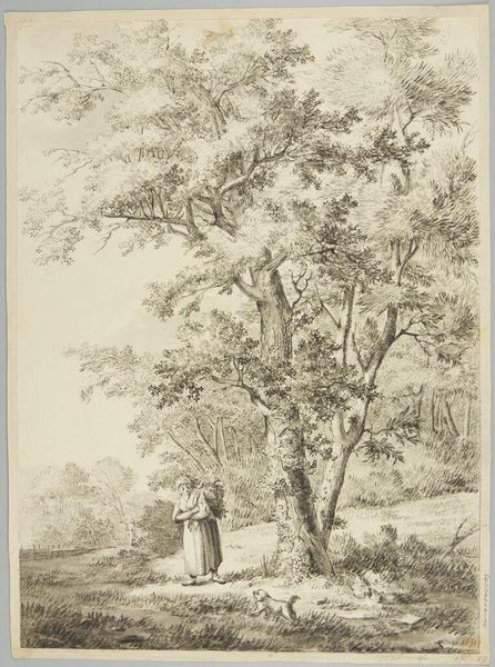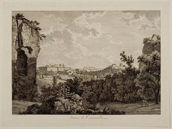 Curator: Bartolomeo Pinelli, born in Rome in 1781, gives us this print, "View from Villa Pamfili." Editor: Oh, it has a quaint, old-world charm. The trees frame a distant villa, and two figures walk the path in the foreground. It feels like a memory. Curator: The umbrella pines, common in Roman landscapes, could symbolize longevity or resilience, echoing Rome's long history. The figures, perhaps pilgrims, suggest a spiritual journey. Editor: Right, and the etching technique, all those fine lines, adds to the feeling of a bygone era. Like a page pulled from a fairytale. Curator: Fairytales often use such imagery to convey a sense of the past, of tradition, and enduring cultural values. Pinelli captures that essence perfectly. Editor: Yes, it really does linger in the mind, doesn't it? Like a half-remembered dream of Rome.