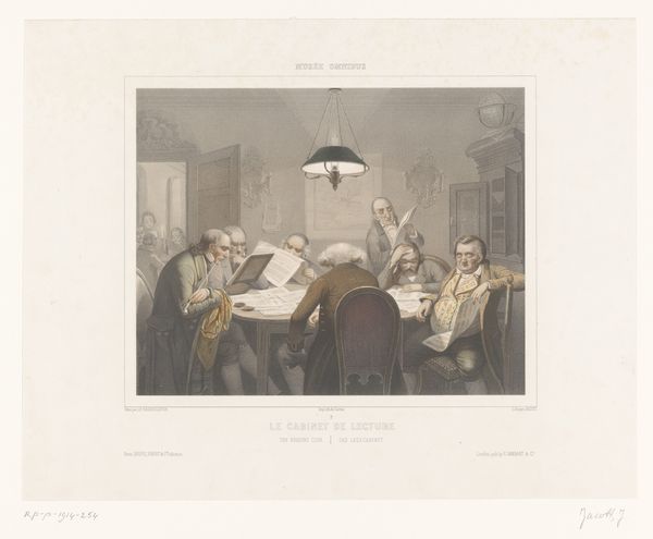 Curator: Let's consider "Drie vrienden vragen een student om mee uit te gaan," created in 1836 by Jules David. The Rijksmuseum is where this particular watercolor is housed. What strikes you first about this scene? Editor: The image, bathed in muted pastel colours, seems to be a melancholic representation of disrupted study. There's an overwhelming feeling of introspection within these lines, primarily concentrated around the student in the center. Curator: I read the scene rather differently, seeing in the interruption and the invitation of the title a reflection of social dynamics. To me, it speaks of the complexities surrounding privilege and opportunity for students. Whose circle are they implicitly invited to join? What might it mean to decline the proposition? Editor: From my point of view, the attire of each of these individuals contains multiple symbolic cues. It's important to think about who the individuals within the painting may symbolize. The student, hunched over and dressed modestly, looks like he has no choice but to focus on his books; his isolation from the rest of society is evident by what he wears, which are common clothes. Now contrast that to the three characters behind him: there's an abundance of class and sophistication in their demeanor. I see class divide represented quite prominently through visual cues. Curator: I agree wholeheartedly. The tophat and finer dress code are undeniably signs of the existing social hierarchy. Furthermore, let's not overlook the composition itself: the positioning of these characters also highlights potential social tension in relation to the social circumstances of students, since in 1836, the opportunity to receive proper formal education may have been barred from numerous groups. I question what is really implied with such imagery. Are these people actual 'friends' or rather a subtle attempt at indoctrination through group acceptance? Editor: Intriguing indeed. If you delve into it, though, it seems that even something seemingly insignificant, such as color use, contains powerful meaning behind its application. Consider that, in general, softer palettes can give the illusion of serenity and calm, whereas harsher colors are perceived more aggressively, due to the heightened visibility caused by this effect within different forms of art overall; this seems purposefully done, in order for them not be seen or remembered easily as much afterwards overall. This further promotes my interpretation in many regards by offering visual context surrounding different emotional responses, based mostly according either positive traits contrasted or compared from differing negatives depending simply regarding perspective changes happening throughout both conscious thoughts influencing overall expression.. Curator: You've added another important layer of interpretation to this, pointing toward muted pastel palettes being something actively considered during planning regarding expression which makes this worthwhile indeed now when understanding different dynamics impacting perspective within such visuals by reflecting how they both shape individual consciousness and thus societal behaviors as a whole! Editor: Thank you—uncovering multiple meanings embedded so cleverly creates another sense surrounding different elements expressed within something. The act adds another exciting meaning, one providing new thoughts by highlighting new concepts introduced within any painting style regardless regarding its application after considering those unique moments surrounding emotional or abstract forms respectively whenever possible!