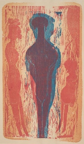 This is Leonard Baskin’s “Old Man Seen from Behind,” a woodcut printed in black on a vibrant red ground. The process of woodcut printmaking is a labor-intensive one. The artist carves an image into a block of wood, then inks the surface and presses paper against it to create a print. Here, the material quality of the wood itself is crucial. Baskin's cuts are assertive, creating a bold, graphic image with a tactile quality. Look closely, and you'll see how the wood's grain influences the texture of the print, adding depth and visual interest. The stark contrast between the black ink and the red background enhances the drama, emphasizing the figure's vulnerability and the passage of time. Baskin was deeply engaged with the history of printmaking, particularly its role in social commentary. By choosing woodcut – a medium with roots in folk art and political broadsides – he imbues the image with a sense of gravitas. The intense labor and physicality involved in the process mirrors the weight of existence etched onto the old man's body. This challenges the traditional hierarchy between fine art and craft, elevating the print to a powerful statement about humanity.