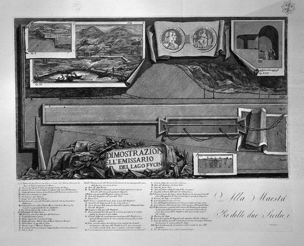 Curator: This work by Giovanni Battista Piranesi is titled "Demonstration from the Lake of Fucino, two boards together, title listed with index." It’s a complex engraving, dense with information. What catches your eye initially? Editor: The sheer amount of detail is striking. It feels almost like an exploded diagram, but rendered with artistic flair. There's a cartographic quality to it, but then you have these romantic, almost theatrical scenes interspersed. Curator: Precisely! Piranesi wasn't merely illustrating a geographical undertaking; he was constructing a visual argument. He utilizes geometric precision but juxtaposes it with dramatic landscape views to evoke a sense of awe. The map elements provide data but, together with the romantic scenes, trigger an emotional understanding. Editor: So it's not just a technical drawing, but a political statement of sorts? An attempt to frame and monumentalize an engineering project. Who was its target audience? Curator: It could be considered a carefully crafted piece of propaganda. I'm especially intrigued by the eagle motif, the geometric forms. The symbolic elements contribute meaning related to governance and legacy. They likely targeted wealthy patrons or governing bodies, emphasizing the grandness and lasting impact of such projects on a region. It is all so calculated. Editor: And it certainly achieves that effect. Look how the different panels are arranged almost like a triptych, elevating its status beyond mere documentation. I wonder how prints like these were circulated and consumed? It’s not an easily digestible image, you need to work to understand it. Curator: Prints offered a relatively affordable medium to reach broader audiences. This was most likely initially created for patrons to see and presented at an exhibition before making it more accessible through printing to further build awareness and approval. Think of them as an early form of public relations, forging collective identity through spectacular imagery of shared history. Editor: It's fascinating to consider the interplay between engineering, artistry, and politics captured in this single sheet. Looking closely, I'm also thinking about who would have produced this kind of detailed drawing at the time. Was Piranesi also an engineer? Curator: That's right; his architectural background clearly influenced his perspective. Beyond simply celebrating infrastructure, Piranesi immortalized human endeavor. What an elaborate, multifaceted document from which we can unravel history! Editor: A testament to how art can serve as both record and rhetorical device, leaving us with questions long after the fact.