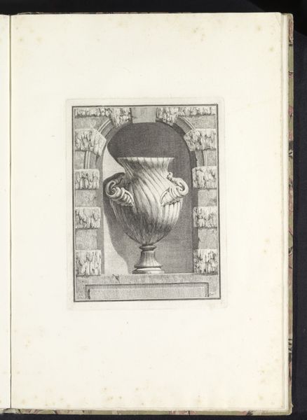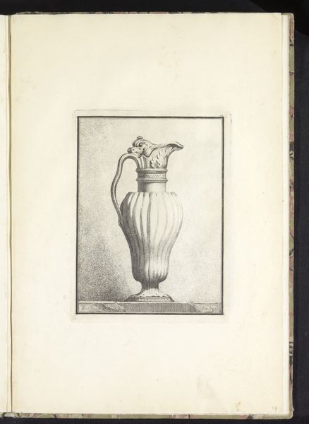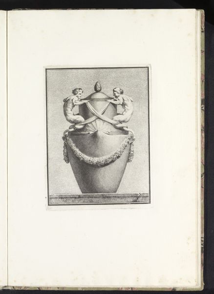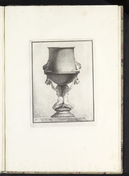 Benigno Bossi created this drawing of a vase with elephant heads and nude nymphs. Executed with delicate lines and subtle shading, the monochromatic study presents an elaborate vase elevated on a stone plinth. The composition is dominated by the ornate structure of the vase, which features spiraling fluting and is adorned with elephant heads and reclining nude nymphs, all contributing to a sense of dynamic movement. The formal elements of the vase reveal a tension between classical order and Baroque exuberance. Its symmetry and classical references give way to the more elaborate, sensual forms of the nymphs and elephant heads, destabilizing the fixity of its design. Bossi's work can be seen as a meditation on form, function, and the semiotic potential of decorative arts to convey meaning and aesthetic pleasure, reflecting the broader cultural and philosophical currents of his time.