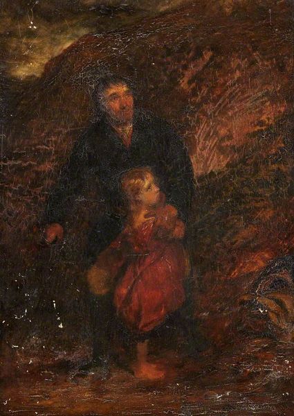 Curator: Welcome. Before us hangs "The Rescue" by Sir John Everett Millais, an oil painting steeped in narrative and rendered with dramatic flair. Editor: The immediate impact is visceral – a kind of organized chaos in the face of potential tragedy. The tight grouping of figures and dramatic lighting really push forward an emotive reading. Curator: Absolutely. Millais, as a Pre-Raphaelite, was attentive to conveying both realistic details and moral weight through his art. Note the fireman's soot-stained face, the vulnerability of the children... all rendered using precise techniques. The composition certainly highlights Victorian values regarding domesticity, bravery, and duty. One sees also reflections on contemporary labor as an act of social contribution and community care. Editor: But what does it signify on a purely visual level? See how the fireman’s dark uniform forms this stark contrast against the fiery background, underscoring that idea of order in chaos. Millais orchestrates colors – darks set against these pockets of vibrant reds, almost dancing flames in the gloom. It's as if the narrative unfolds in gradations of dark and light, from terror to tentative hope. Curator: Contextually, this narrative is charged with a complex understanding of Victorian anxieties regarding family and public duty. "The Rescue" offers a visual dialogue about safety and peril. Millais here seems to explore working-class heroes and a societal acknowledgment of sacrifice—consider the resources directed toward making the fireman such a recognizable figure, for example. Editor: True, and beyond subject and composition, one might see the raw materiality of paint itself playing an active role: Thick impasto around the highlights hints at urgency. Curator: So, we’ve touched on both its formal composition and social framework... Editor: Leading us, hopefully, toward a more complete, enriching engagement with Millais' dramatic scene.