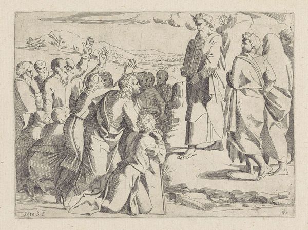 Cornelis de Wael’s "Picknick in de bergen" is a small etching dominated by dense, parallel lines that create a textured surface. The compact composition captures a social gathering in a mountainous setting. De Wael uses line to define forms and create a sense of depth. The figures, grouped closely together, are rendered with a combination of short, quick strokes and longer, more deliberate lines. This contrast in linework gives the scene a dynamic quality, suggesting movement and energy within the stillness of the picnic. The etching technique flattens the image, bringing the foreground and background into a unified plane. The arrangement of the figures around the rock formation, combined with the linear precision, brings to mind the structured compositions of classical art. The artwork merges a casual scene with formal artistic elements, offering an image of leisure that is both spontaneous and carefully constructed.