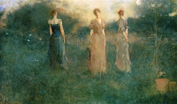 Thomas Wilmer Dewing crafted "In the Garden," a painting that evokes a timeless scene of ethereal grace. Here, three women stand amidst a lush, green landscape under the soft glow of a distant moon, archetypically representing nature, emotion, and memory. The figures, reminiscent of the classical Three Graces, are found repeatedly across history. From ancient Roman frescoes to Renaissance paintings, they symbolize beauty, charm, and joy, often depicted in gardens as a paradisiacal retreat. But here, Dewing infuses this classical motif with a touch of melancholic introspection; the women are isolated from one another, their expressions unreadable, suggesting a deeper contemplation. This evokes a psychoanalytic reading, where the garden becomes an inner landscape, and the figures represent different facets of the self, each lost in their thoughts, hinting at the complexities of the human psyche. This image then, in its cyclical progression, resurfaces the classical, yet evolves to reflect modern, psychological complexities.
