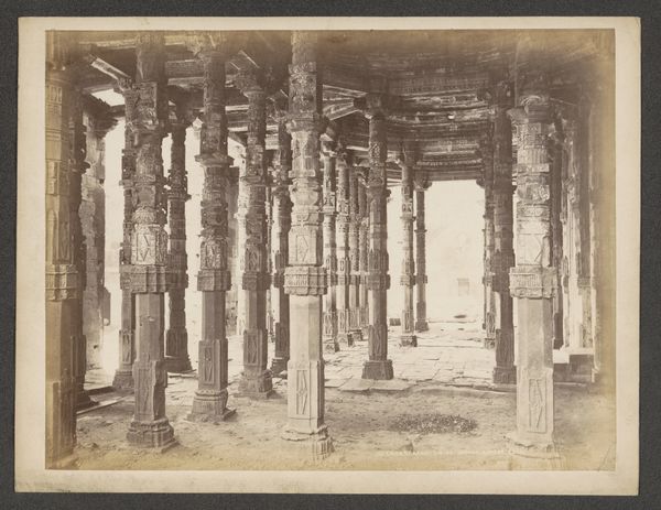 Samuel Bourne captured this view of the ornamental colonnade at the base of the Qutb Minar in Delhi using a photographic process. The composition leads your eye along a rhythmic sequence of pillars. Note how each pillar is divided into distinct sections by horizontal bands of carved designs. This division creates a modular structure, emphasizing both the individual components and the unified whole of the colonnade. The use of light and shadow further articulates the texture and depth of the stone carvings, offering a sensory experience of the architectural space. Bourne’s choice to frame the colonnade with natural elements introduces a dialogue between organic and constructed forms, questioning our understanding of permanence and change. This photograph invites reflection on how we perceive historical sites—not just as static monuments, but as dynamic spaces shaped by time and human interaction.