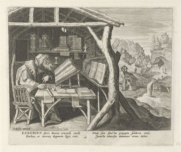 Editor: We're looking at "Holy Woman of Jerusalem," an engraving by Jan (II) Collaert from around 1570 to 1618. It has a really serene quality to it, despite the stark lines of the engraving. I'm curious about the symbolism within this piece, could you share your insights? Curator: The symbols are fascinating, aren't they? The image presents a woman, enclosed in what appears to be a hermitage or a small shelter. What feelings does that enclosed space evoke for you? Editor: A sense of both protection and confinement, maybe voluntary imprisonment for spiritual reasons. Curator: Precisely! Notice how the architectural details aren't just decorative but contribute to this theme. The hermitage isolates her from the world, signified by the small offering she receives from the monk – sustenance, but also a connection to the outside world. This suggests the dichotomy between worldly rejection and reliance on community. But what about the landscape behind them? Editor: The landscape seems idyllic, yet also separate from the immediate enclosure, reinforcing her choice. Is the act of offering related to earlier Christian symbology of women and charity? Curator: Absolutely! Charity is visualized, here. This connects her with the earlier ideas, but in a late-Renaissance world, images like this speak of inner spiritual strength achieved through denial and faith. The landscape and architectural setting were laden with religious and social symbolism; images like this served not only as art, but instruction. What do you take away from how the artist weaves all this together? Editor: It's fascinating how it portrays not just religious devotion, but also comments on society's view of women and religion at the time through its complex layering of symbols. Curator: Exactly. By unpacking these layers of symbolic meaning, we reveal aspects of cultural memory and continuity, deepening our comprehension of this artwork and its era.