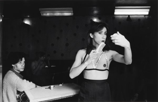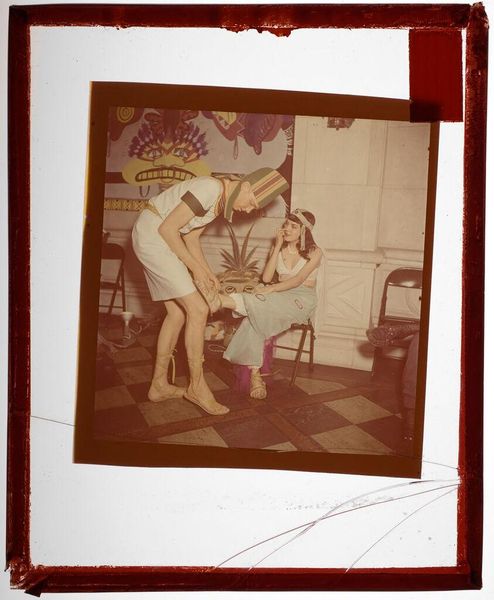 Curator: Bill Dane's "Untitled (S. F.)" presents us with a fascinating interplay of light and shadow, captured on a modest 12.5 x 17.6 cm sheet. Editor: The initial impression is unsettling. The high contrast and theatrical poses evoke a sense of underlying social tension. Curator: Indeed, the composition directs our gaze through a geometric backdrop, juxtaposing rigid lines with the figures' expressive gestures. Semiotically, the starkness emphasizes the interplay between form and emotion. Editor: I see it as a commentary on societal constraints and the performance of identity. The figures seem trapped within this artificial construct, their exaggerated expressions hinting at suppressed anxieties. Curator: Perhaps. Though one cannot deny Dane’s mastery in orchestrating the visual elements to create such a compelling image. Editor: Absolutely, and the image's strength lies in its ability to spark discourse about representation. Curator: A work that continues to challenge our perceptions of art. Editor: And its role in reflecting our anxieties.