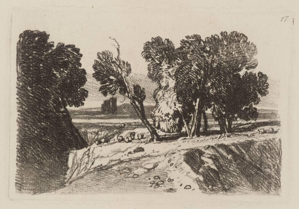 Curator: Welcome. We're looking at an ink drawing by Hryhorii Havrylenko, dating from 1956. It’s an illustration for Mikhail Stelmakh's book, "In the Hedgehog's Windmill". Editor: It has a fairytale feeling. Nostalgic and pastoral, but also something melancholic about it. Is that little girl lost? Curator: The scene is a Ukrainian village. We can see the child standing at a crossroads between two very large trees and a group on a cart is faintly visible on the horizon. A figure rests on a fence. Editor: You can really see the hand of the artist at work here. It is literally illustration—done to illustrate the story, a book for young people. The materiality is interesting, though, the paper looks very low grade, aged, perhaps dictated by the limited resources of the time? Curator: Exactly. The process of creating illustrations for children's books often involved collaboration with publishing houses and limitations in printing technology. The quality of the paper stock and ink reflect those economic and industrial realities. The simple act of the girl holding a basket connects to themes of food and sustenance during a period where collective farming was dominant. Editor: How are these power structures manifesting themselves on the community at the time, in its visual vocabulary? Curator: I find that by looking at these visual details in a landscape setting, it allows one to assess historical power dynamics in the countryside as well as the ways these details permeated both political policy and popular cultural consciousness in this time period. The choice of landscape also offers ways to consider human connection to ecology and agrarian culture. The little girl also becomes part of a lineage. The landscape offers an opening to view the role of women within its boundaries, both imagined and real. Editor: And the simplicity of ink drawing as a medium… it seems well suited to capture the straightforward reality. No fancy painting techniques. Just line, form and stark reality. Curator: An interesting thought. We often view these choices as limiting; However, I think ink allows an unfiltered quality that focuses on precision and observation—reflecting themes found within Stelmakh’s stories themselves! Editor: That's a strong point. The visual vocabulary creates an impression which reflects its context and, at the same time, is beautiful as is. Curator: It gives a lens through which to see art production during that time. Editor: Exactly, this dialogue enriches how we appreciate it on its own merit.